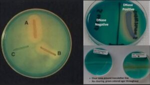 – افتراق Staphylococcus aureus مثبت DNase از گونههای منفی DNase مانند Staphylococcus epidermidis