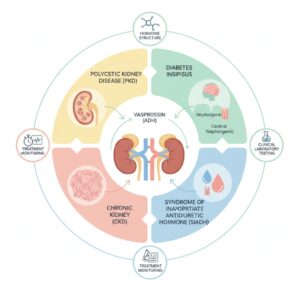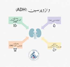 وازوپرسینهورمونی کلیدی در حفظ تعادل آب و عملکرد کلیه است. تغییرات در سطح یا پاسخ بدن به این هورمون میتواند با بیماریهایی مانند PKD، دیابت بیمزه، SIADH و نارسایی کلیه ارتباط داشته باشد. پایش دقیق و استفاده متعادل از داروهای مربوطه میتواند اثرات منفی بر کلیه را کاهش دهد و کیفیت زندگی بیماران را بهبود بخشد.