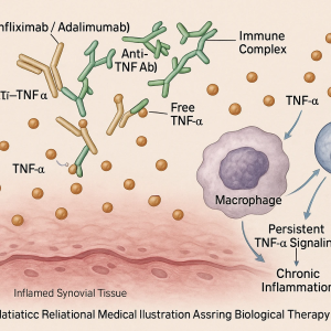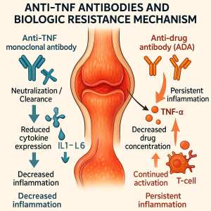 تشکیل Anti‑TNF Ab منجر به کاهش سطح سرمی داروی فعال و تحلیل تدریجی اثر درمانی میشود.