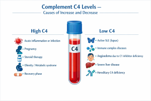 C4 پایین اغلب نشانه مصرف کمپلمان در بیماریهای خودایمنی یا آنژیوادم ارثی است و C4 بالا معمولاً نشانه التهاب یا پاسخ ایمنی بدن است. این آزمایش باید همراه با C3، CH50، علائم بالینی و سایر تستها تفسیر شود.