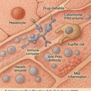 در بدن انسان، سیستم سیتوکروم P450 نقش کلیدی در متابولیزه کردن داروها و سموم دارد. اما گاهی همان مسیر دفاعی در برابر مواد شیمیایی خارجی، به واکنش ایمنی خودی تبدیل میشود. در این حالت، بدن علیه آنزیمهای P450 خود، **آنتیبادیهای ضد سیتوکروم P450 (Anti‑Cytochrome P450 Antibodies)** تولید میکند که میتواند سبب ایجاد بیماریهای خودایمنی ناشی از دارو (Drug‑Induced Autoimmune Reactions) مانند هپاتیت خودایمنی دارویی شود.