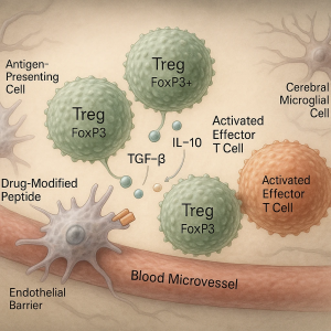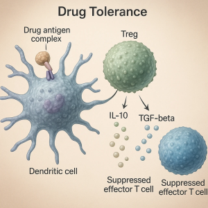 سلولهای T تنظیمی (CD4⁺ CD25⁺ FOXP3⁺) با ترشح سایتوکاینهای سرکوبگر مانند IL‑۱۰ و TGF‑β، تعادل دقیق بین واکنش دفاعی و تحمل ایمنی را برقرار میکنند. در شرایط طبیعی، حضور Treg باعث میشود بدن دارو یا پروتئین تزریقی را تحمل کند و علیه آن آنتیبادی تولید نکند.