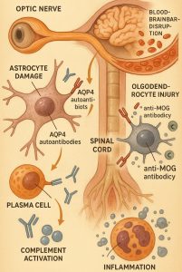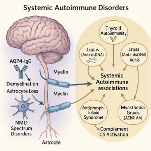 - همپوشانی با بیماریهای خودایمنی دیگر: مانند لوپوس (SLE)، سندرم شوگرن، و آنتیفسفولیپید سندرم (APS) که میتوانند تولید آنتیبادیهای ثانویه علیه AQP4 یا MOG را تحریک کنند.