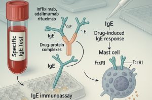 با گسترش استفاده از داروهای بیولوژیک در درمان بیماریهای خودایمنی و التهابی مزمن مانند روماتوئید آرتریت، کولیت اولسراتیو و مولتیپل اسکلروزیس، بروز واکنشهای حساسیتی ناگهانی به این داروها نیز افزایش یافته است. یکی از ابزارهای مهم در تشخیص این نوع واکنشها، تست IgE اختصاصی ضد داروهای بیولوژیک است. این تست میتواند مشخص کند که آیا پاسخ ایمنی آلرژیک از نوع فوری (IgE-mediated) در برابر داروی مورد نظر شکل گرفته است یا خیر. تشخیص سریع این واکنشها، مانع بروز شوک آنافیلاکتیک و قطع غیرضروری درمان میشود.