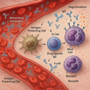 ایمونوگلوبولین E (IgE) از آنتیبادیهایی است که در تنظیم پاسخهای حساسیتی فوری، بهویژه در آلرژیهای دارویی، نقش کلیدی دارد. تولید آنتیبادیهای IgE اختصاصی علیه یک داروی بیولوژیک به معنی فعال شدن سلولهای ماستسل (mast cell) و بازوفیلها در مواجهه مجدد است. رهاسازی هیستامین و سایر میانجیهای التهابی از این سلولها موجب بروز علائمی مانند کهیر، اسپاسم برونش یا کاهش فشار خون میشود.