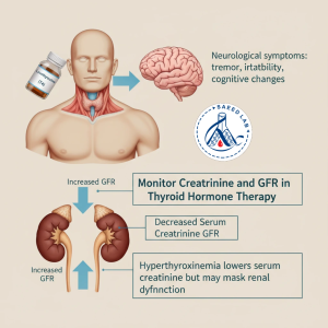 پرکاری تیروئید دارویی پدیدهای قابل پیشگیری اما بالینی مهم است که در پی مصرف بیش از حد لووتیروکسین رخ میدهد. تأثیر آن بر کراتینین سرم — شامل کاهش ظاهری و افزایش Clearance کلیوی — میتواند منجر به سوءتفسیر عملکرد کلیه شود. افزون بر آن، این تغییرات متابولیک ارتباط نزدیکی با تحریکپذیری عصبی و ضعف عضلانی دارند. تشخیص بهموقع، تنظیم دوز و پایش متناوب کراتینین و TSH نقش کلیدی در پیشگیری از عوارض نورولوژیک دارد.