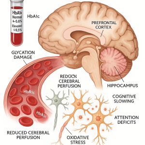 – در HbA1c‌های نسبتاً طبیعی (۵.۵–۶٪) ولی با علائم شناختی، باید احتمال افت قند خون‌های مکرر (Hypoglycemia Unawareness) یا نوسان قند شدید روزانه بررسی شود که می‌تواند در عملکرد ذهنی تأثیرگذار باشد.