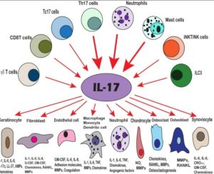 IL‑۱۷ گروهی از سیتوکینهای التهابی است که عمدتاً توسط لنفوسیتهای T زیرگروه Th17 تولید میشود. این مولکولها در دفاع طبیعی بدن علیه عفونتهای قارچی و باکتریایی نقش دارند، اما در شرایط خاص، موجب التهاب بیشازحد و خودایمنی میشوند.