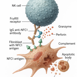 – **افزایش تخریب بافتی از طریق ADCC (Antibody‑Dependent Cellular Cytotoxicity):** اتصال NFC1 Ab به سلولهای خودی دارای گیرنده Fc میتواند تخریب نابجا ایجاد کند.